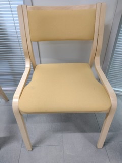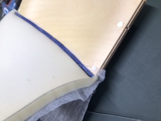 Nämä istuimet olivat päällisin puolin ehjiä, kangas tosin oli jo tunkkainen, mutta puuosat mainiossa kunnossa. Niille ei tehty mitään. Pyrittiin lähinnä suojelemaan kolhuilta ja muilta vahingoilta purkuvaiheessa. Verhoilut pois, uusien vaahtomuovipehmusteiden ja pintaharson leikkaus, liimaukset, kaavojen teko ja kankaan leikkaus. Selkänojan sininen verhoilulista käytettiin uudestaan. Istuinosan verhoilussa apuna käytettiin paineilmakäyttöistä prässiä. Naulaimella sivut kiinni ja kulmien viimeistely ilman prässiä.